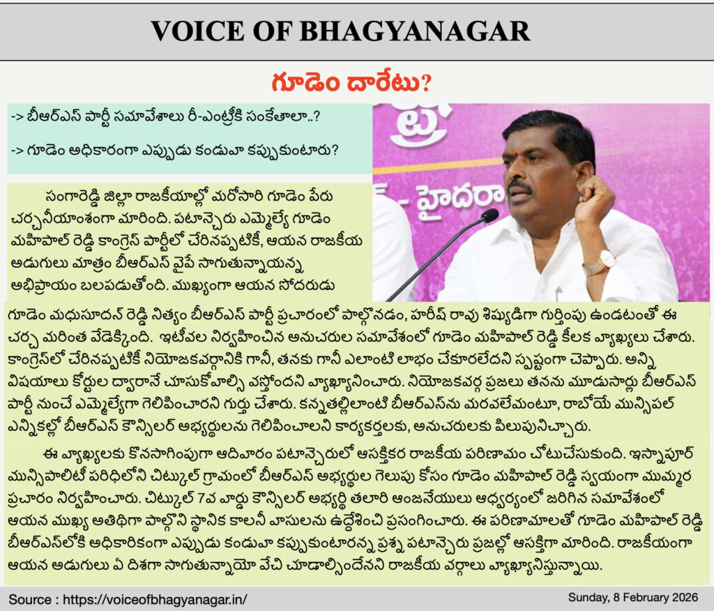 సంగారెడ్డి జిల్లా రాజకీయాల్లో మరోసారి గూడెం పేరు చర్చనీయాంశంగా మారింది. పటాన్చెరు ఎమ్మెల్యే గూడెం మహిపాల్ రెడ్డి కాంగ్రెస్ పార్టీలో చేరినప్పటికీ, ఆయన రాజకీయ అడుగులు మాత్రం బీఆర్ఎస్ వైపే సాగుతున్నాయన్న అభిప్రాయం బలపడుతోంది. ముఖ్యంగా ఆయన సోదరుడు గూడెం మధుసూదన్ రెడ్డి నిత్యం బీఆర్ఎస్ పార్టీ ప్రచారంలో పాల్గొనడం, హరీష్ రావు శిష్యుడిగా గుర్తింపు ఉండటంతో ఈ చర్చ మరింత వేడెక్కింది.
