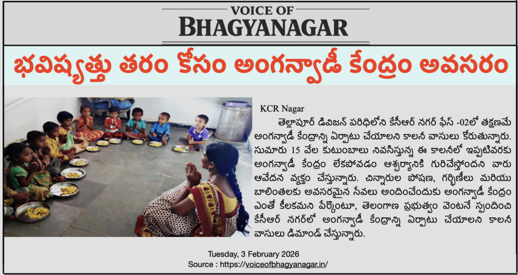 తెల్లాపూర్ డివిజన్ పరిధిలోని కేసీఆర్ నగర్ ఫేస్ -02లో తక్షణమే అంగన్వాడీ కేంద్రాన్ని ఏర్పాటు చేయాలని కాలనీ వాసులు కోరుతున్నారు. సుమారు 15 వేల కుటుంబాలు నివసిస్తున్న ఈ కాలనీలో ఇప్పటివరకు అంగన్వాడీ కేంద్రం లేకపోవడం ఆశ్చర్యానికి గురిచేస్తోందని వారు ఆవేదన వ్యక్తం చేస్తున్నారు. చిన్నారుల పోషణ, గర్భిణీలు మరియు బాలింతలకు అవసరమైన సేవలు అందించేందుకు అంగన్వాడీ కేంద్రం ఎంతో కీలకమని పేర్కొంటూ, తెలంగాణ ప్రభుత్వం వెంటనే స్పందించి కేసీఆర్ నగర్లో అంగన్వాడీ కేంద్రాన్ని ఏర్పాటు చేయాలని కాలనీ వాసులు డిమాండ్ చేస్తున్నారు.