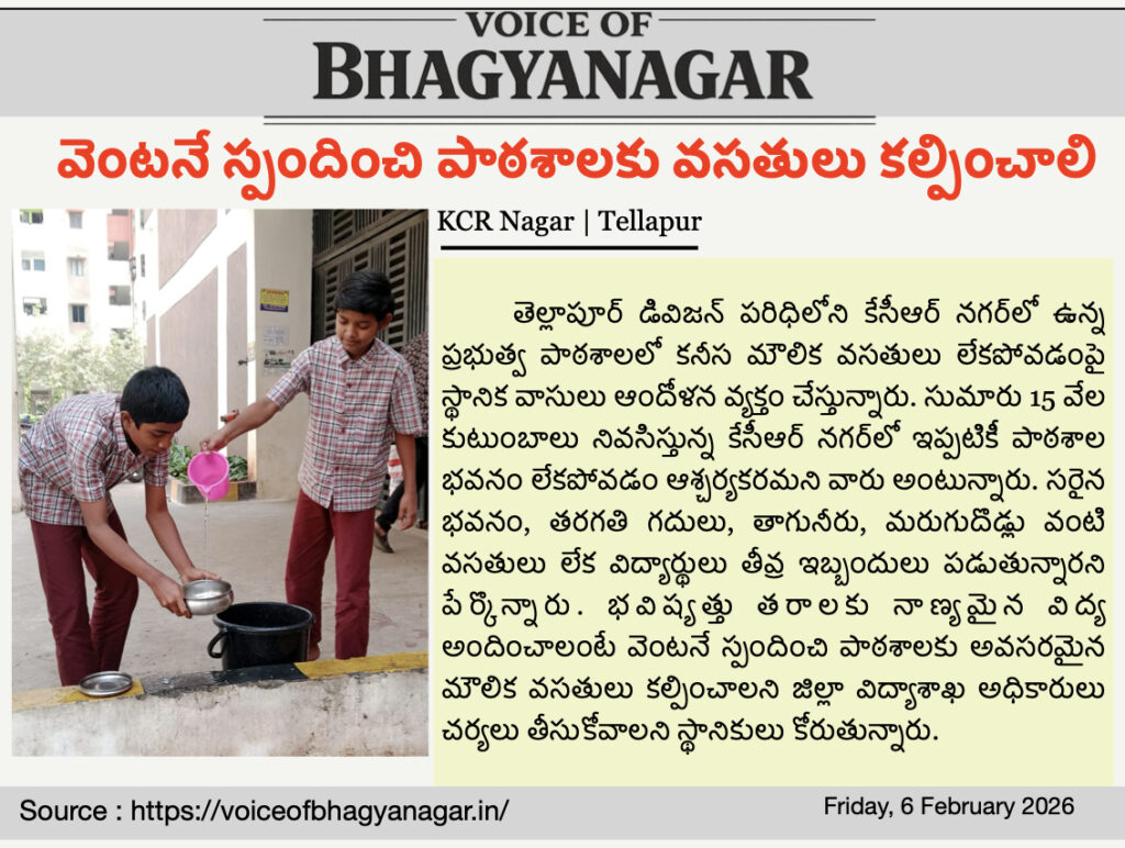 తెల్లాపూర్ డివిజన్ పరిధిలోని కేసీఆర్ నగర్‌లో ఉన్న ప్రభుత్వ పాఠశాలలో కనీస మౌలిక వసతులు లేకపోవడంపై స్థానిక వాసులు ఆందోళన వ్యక్తం చేస్తున్నారు. సుమారు 15 వేల కుటుంబాలు నివసిస్తున్న కేసీఆర్ నగర్‌లో ఇప్పటికీ పాఠశాల భవనం లేకపోవడం ఆశ్చర్యకరమని వారు అంటున్నారు. సరైన భవనం, తరగతి గదులు, తాగునీరు, మరుగుదొడ్లు వంటి వసతులు లేక విద్యార్థులు తీవ్ర ఇబ్బందులు పడుతున్నారని పేర్కొన్నారు. భవిష్యత్తు తరాలకు నాణ్యమైన విద్య అందించాలంటే వెంటనే స్పందించి పాఠశాలకు అవసరమైన మౌలిక వసతులు కల్పించాలని జిల్లా విద్యాశాఖ అధికారులు చర్యలు తీసుకోవాలని స్థానికులు కోరుతున్నారు.